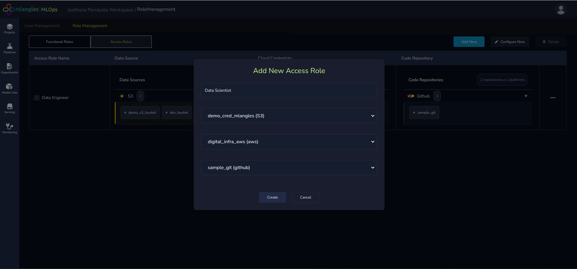 To create access roles, first configure credentials in the Configure New section of Access Roles, then group the required credentials to form an access role. Similarly, create functional roles by assigning read, write, and delete permissions to specific modules. Both functional and access roles can be assigned to users to control access to features and the credentials used in them.