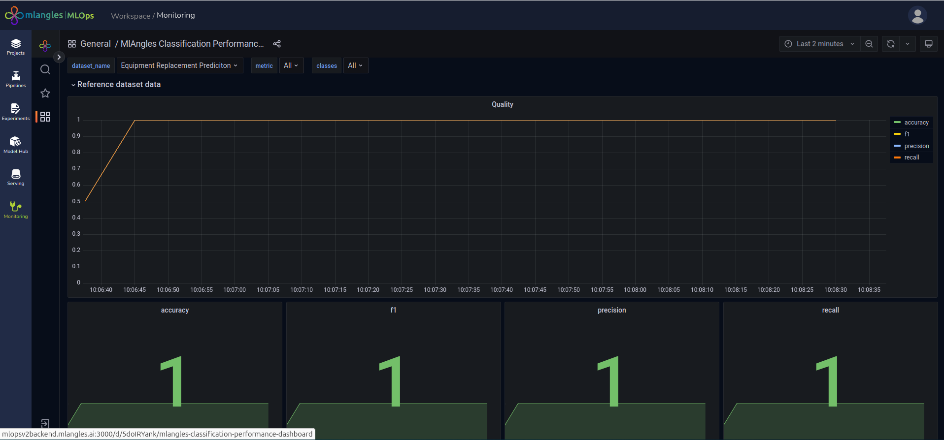 - Classification Performance Dashboard – Evaluates the performance of classification-based machine learning models by tracking metrics such as quality and confusion over time.