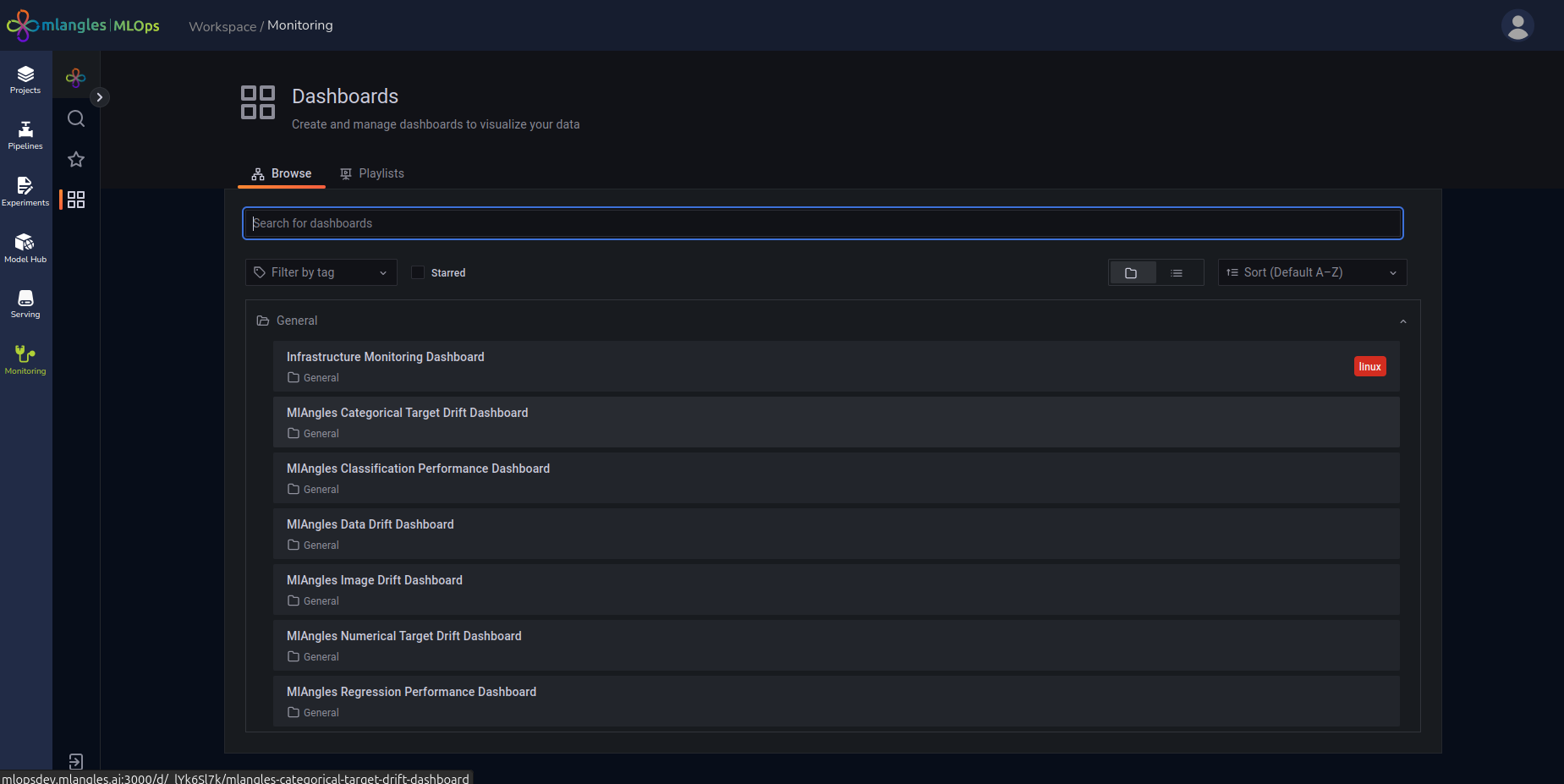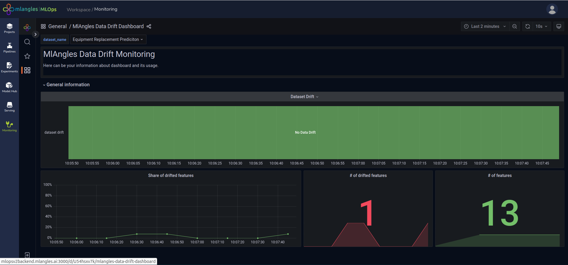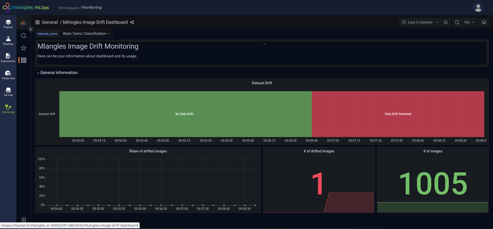 - Image Drift Dashboard – Detects changes in the statistical properties of image datasets processed in the pipelines, ensuring that models trained on visual data remain relevant to current input patterns.