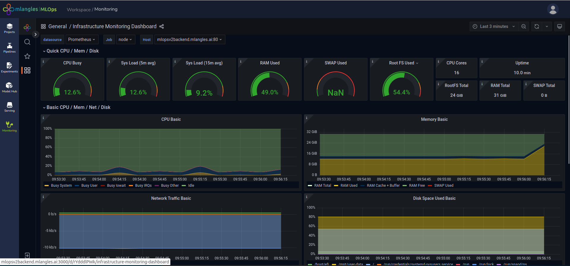 - Infrastructure Dashboard – Tracks the infrastructure metrics associated with the platform deployment. This includes compute usage, memory consumption, and other operational indicators essential for maintaining system stability.