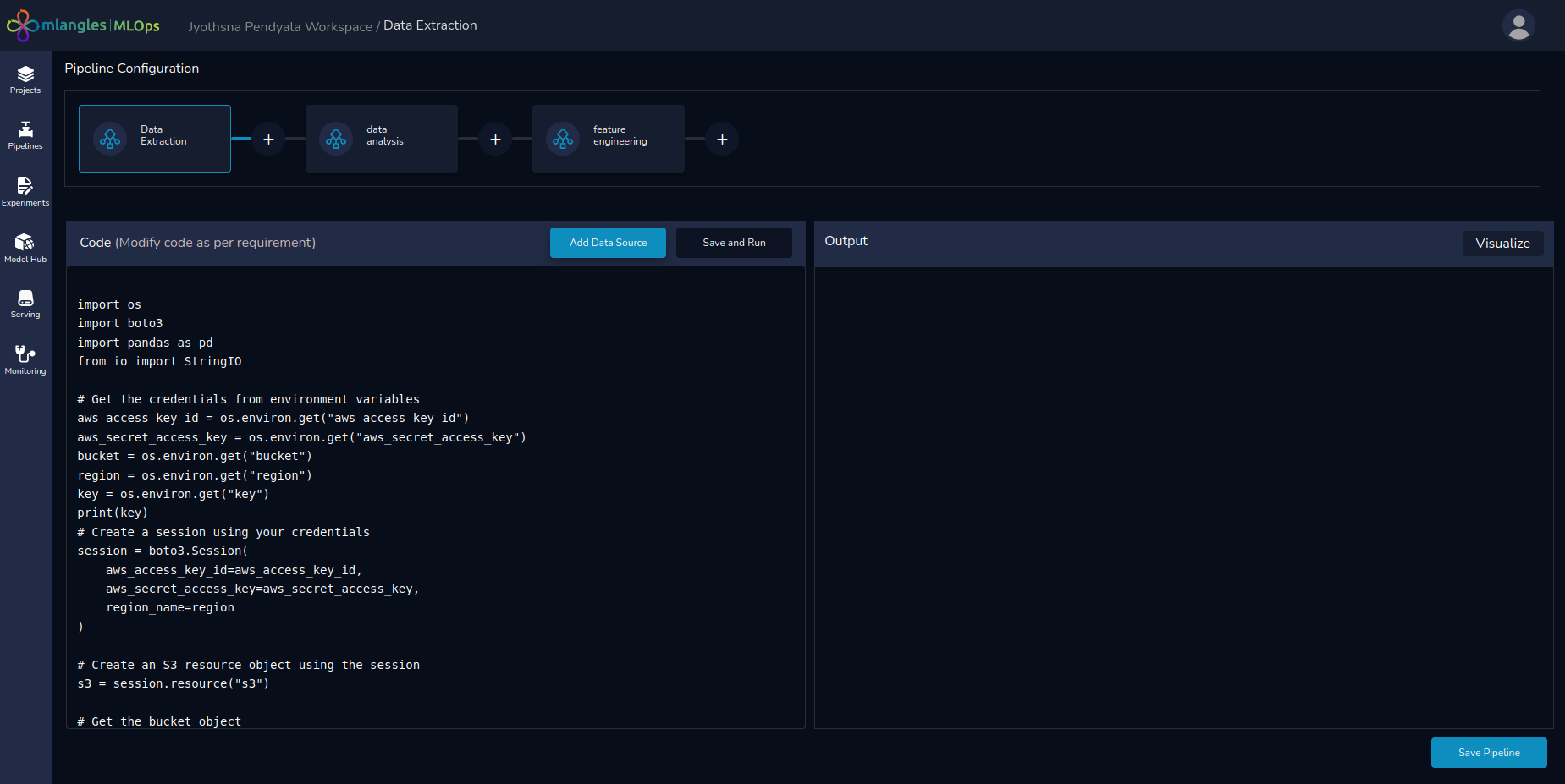 - Upload – Apart from generating code, the user also has an option to reuse any prewritten code scripts that they may have. These can be uploaded to any pipeline step using the upload button.