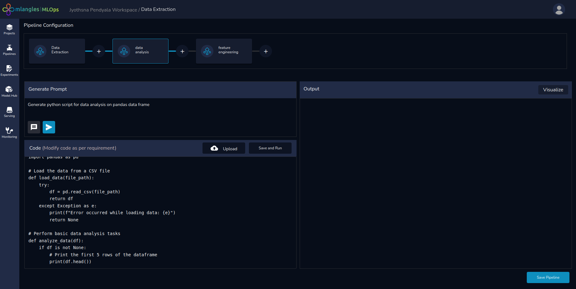 - Upload – Apart from generating code, the user also has an option to reuse any prewritten code scripts that they may have. These can be uploaded to any pipeline step using the upload button.